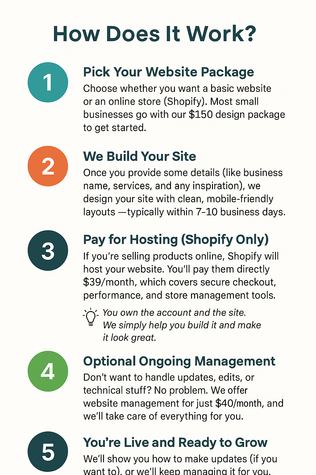 We break it all down for you — no confusing tech talk. You’ll know exactly what you’re paying for, including Shopify’s $39/month hosting fee and optional $40/month site management from us.